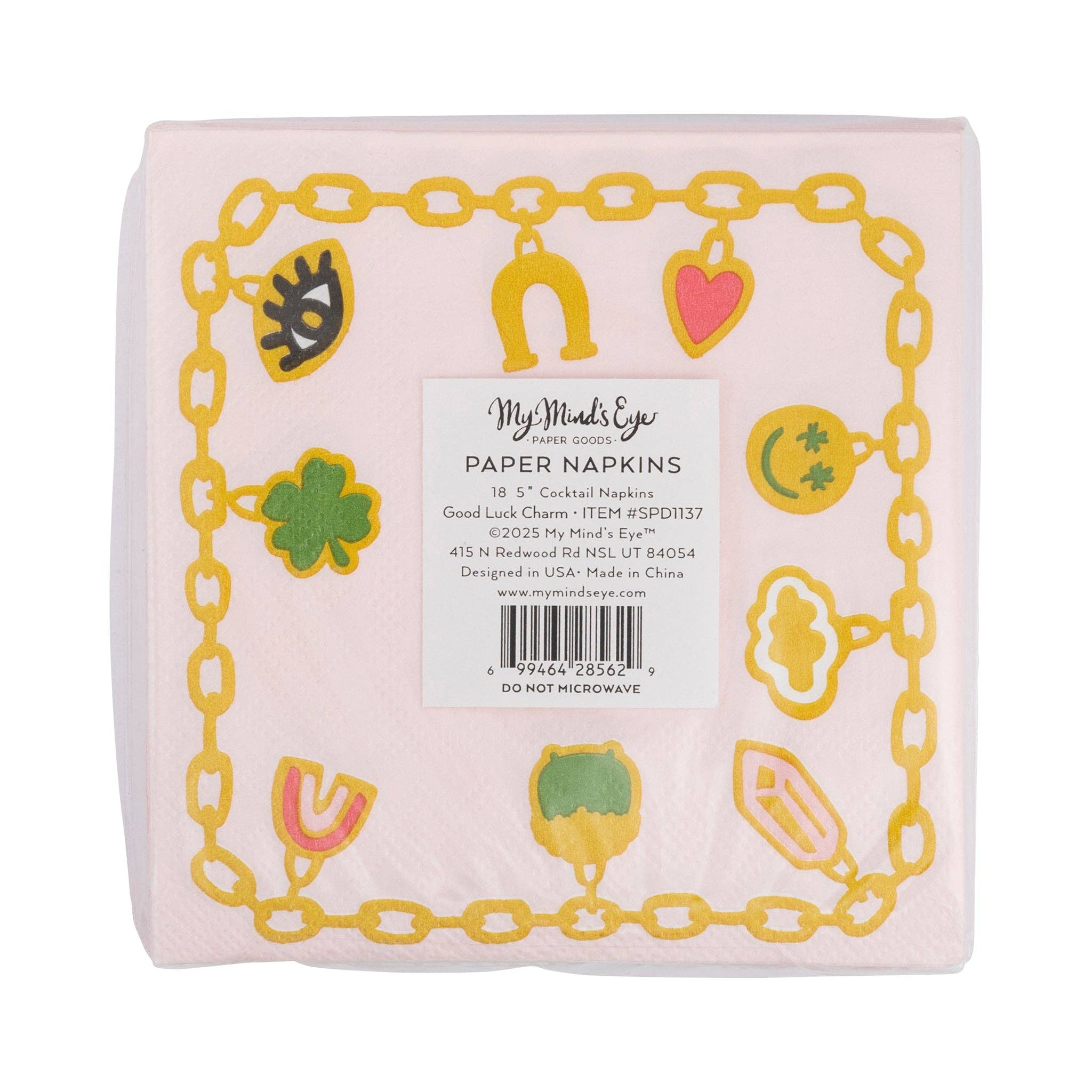 Add a touch of good luck to your next party with our Good Luck Cocktail Napkin. This quirky napkin serves as both a functional party essential and a charming good luck charm. Perfect for any celebration or gathering, this napkin is sure to bring good vibes and a playful touch to your event. • 18 5 x 5 inch shaped paper napkins • gold foil