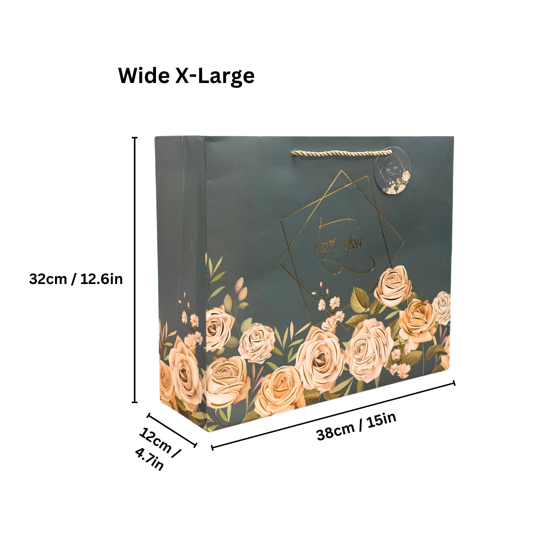 ● Wide X-Large: 32 cm x 38 cm x 14 cm (12.6 in x 15 in x 5.5 in).  Sorry, pattern cannot be chosen.  You will get one of the 4 designs shown.  If multiple gift bags are ordered, we will be sure to assort the designs shown.  Made of heavy paper with fabric ribbon handles.