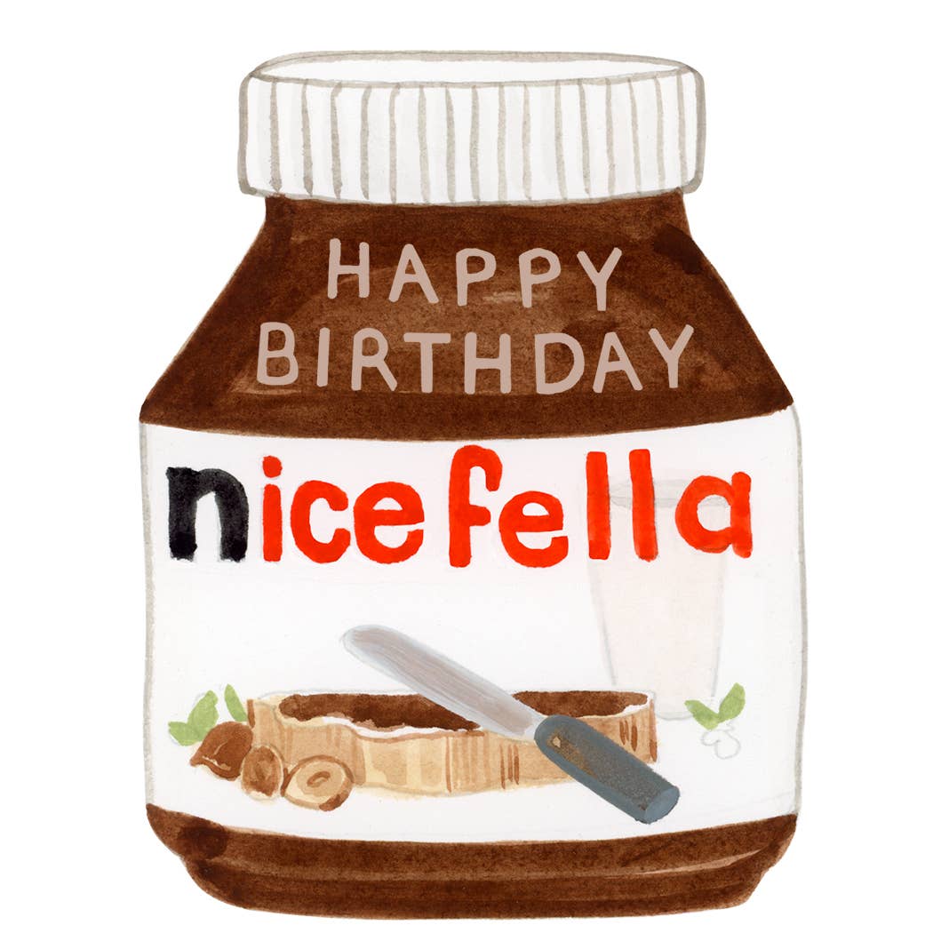 Hand painted Nutella jar text reads “Happy Birthday Nicefella” Details: Size A2 (4 ¼" x 5 ½") Printed on soft white paper and paired with a matching soft white envelope. Blank interior for personal message